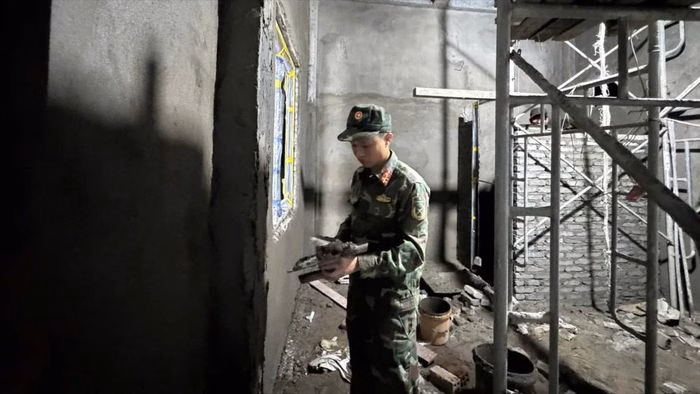 Địa hình lầy lội, các ngôi nhà bị sập nằm cách xa khu dân cư, khiến xe chở vật liệu không thể tiếp cận. Vì vậy, hơn 200 chiến sĩ đã phải mang bao tải cõng gạch, cát, xi măng qua các con đường ngập nước – một công việc vất vả nhưng không làm giảm tinh thần.
