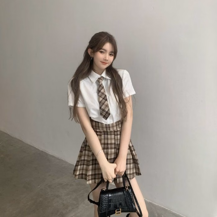 🔥 {TNN-Oder}Bộ trang phục phong cách đại học retro, đầm kẻ caro không đều, áo sơ mi ngắn tay vá cho nữ sinh mùa hè đang giảm giá!